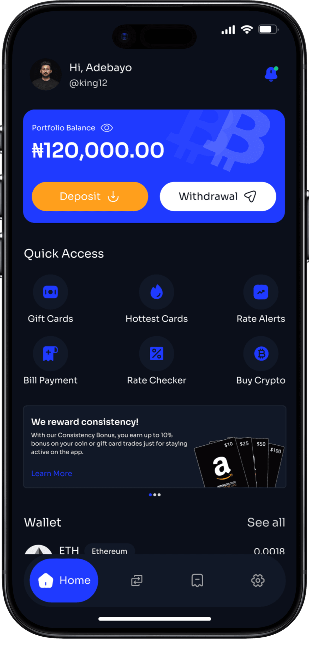 Fast, secure services to redeem gift cards, trade crypto, and pay bills with instant Naira transactions — all in one app.